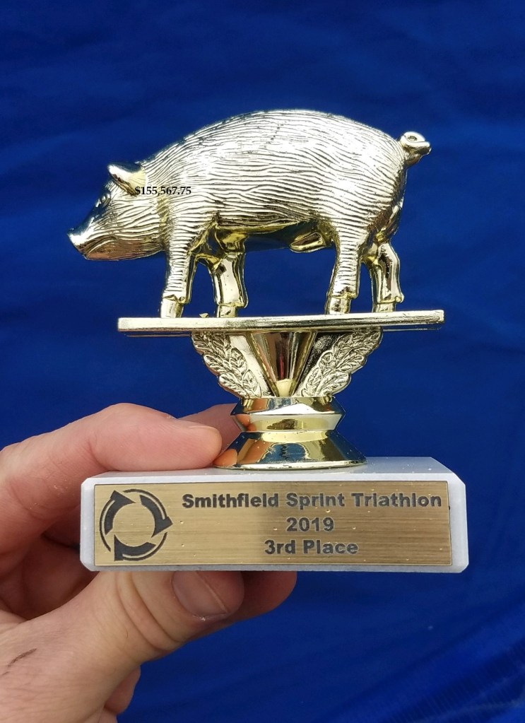 The home stretch is a long straight away, and I kept looking over my shoulder to make sure I wouldn’t get passed at the very end. I finished the run at an average pace of 7:19, and while it wasn’t my best effort, it was still good enough to lock up an age group win by 33 seconds. A good start to 2024, and another first place AG pig trophy for the window ledge that serves as my trophy shelf. Probably the single greatest trophy in all of sports.