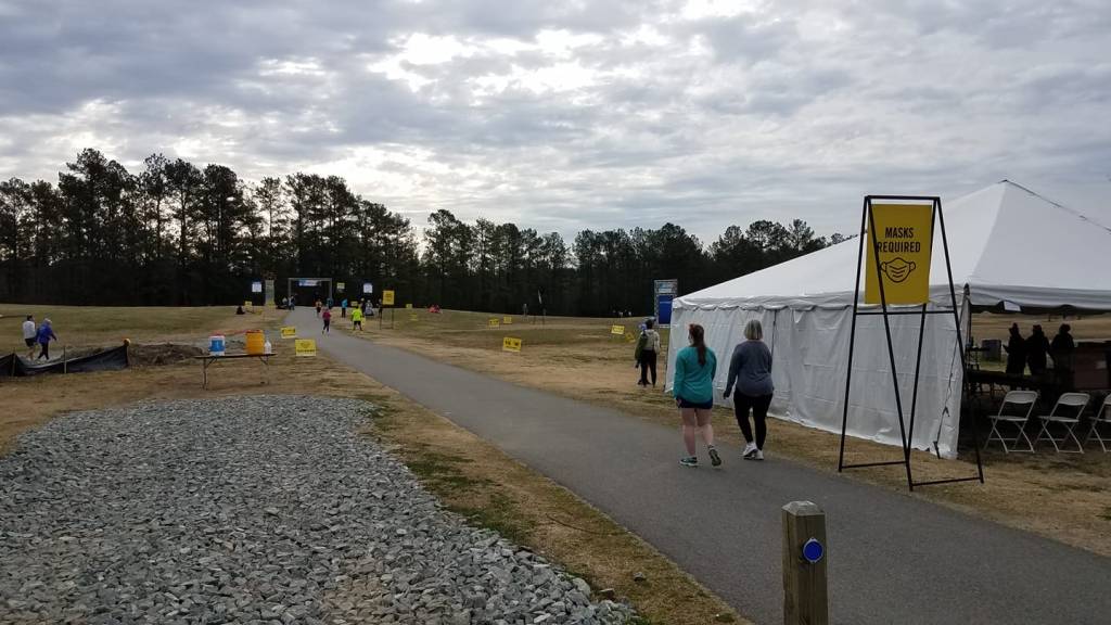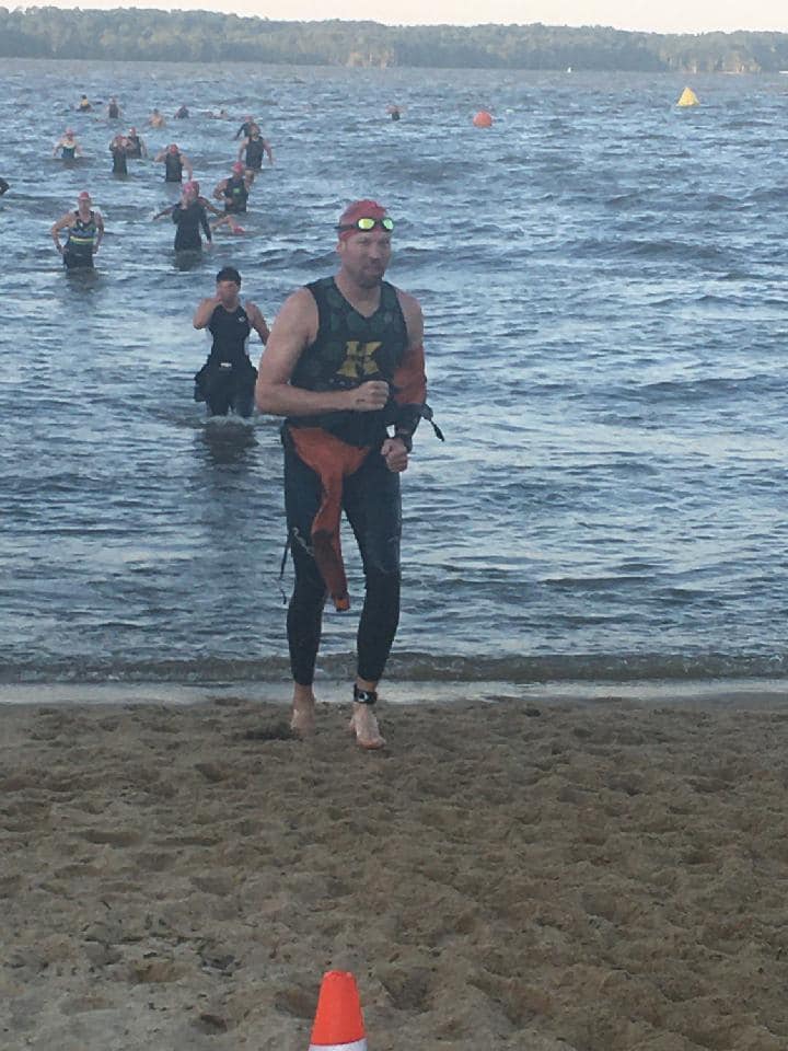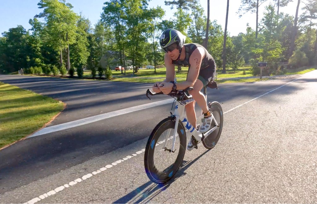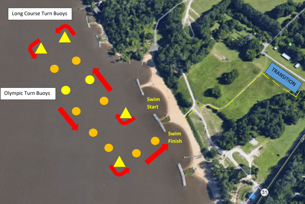 On race morning, I woke up early for the drive to Smithfield and donned my Flo Factory trisuit for the first time since Ironman 70.3 North Carolina in October. I could tell that I was over race weight, and was thankful for the expansive properties of Spandex. The zipper was a bit disagreeable, but ultimately performed its duties, albeit a bit begrudgingly. I arrived at the race site when transition opened and snagged a good spot at the end of the rack reserved for the Richmond Tri Club. It was a bit chilly that morning, and I wasn’t really looking forward to the first few miles on the bike while wet from the swim. After warming up a bit, I took my place in line for the self-seeded pool swim and hoped that riding a bike was….well…like riding a bike.