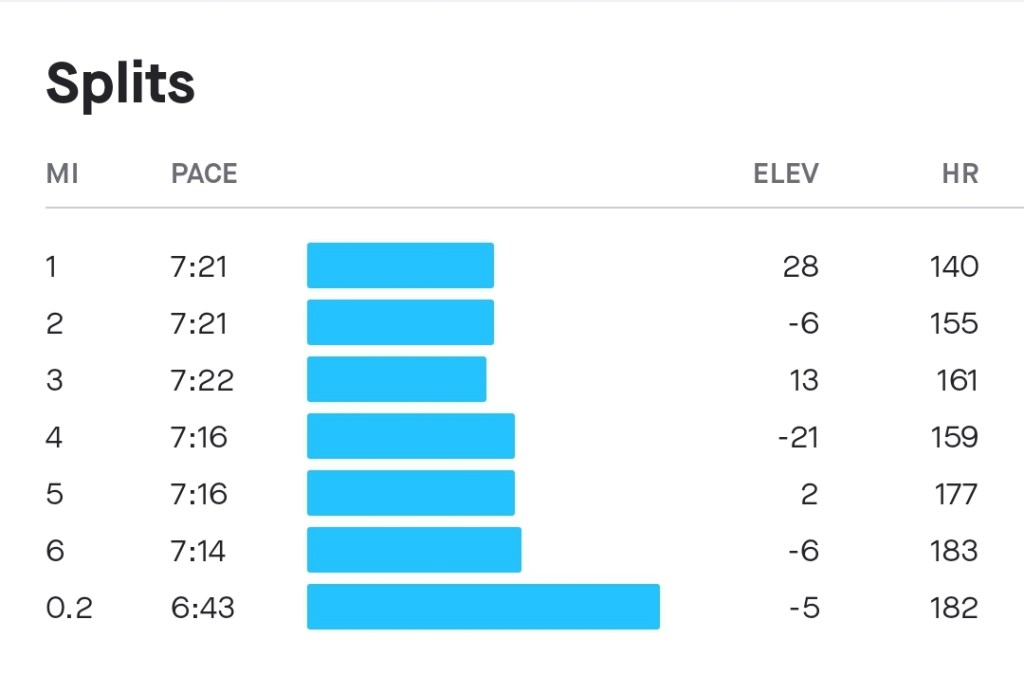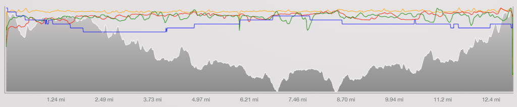 The start of the second mile is uphill, and I was feeling pretty good by that point and pushed it up the hill. I was able to pass a few people, and didn’t really have anyone going past me. The wind was with me a bit as I headed toward the turnaround cone, but was against me after the turn. I kept the pace up and was feeling reasonably good as I headed back down the hill that started mile 2 in the other direction.