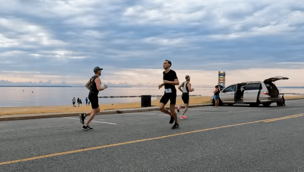 I knew from prior experience that it takes my Garmin at least a half mile to show a reasonably accurate run pace in tri-mode when coming out of T2. It had me around an 8:30 pace about a quarter-mile in, but I didn’t panic and knew that it would come down. It took me about a half mile to get my legs right, and then I started settling in to the run. The Garmin showed 7:26 after the first mile, and I was ok with that since I typically negative split this run course.